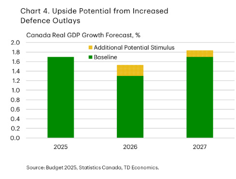 Bottom line: Defence spending will help stabilize growth and deliver a small macro upside (up to ~0.2% GDP in 2026), but the true long-term payoff hinges on execution speed and whether Canada uses this moment to deliberately build a deeper domestic defence supply chain rather than importing it.