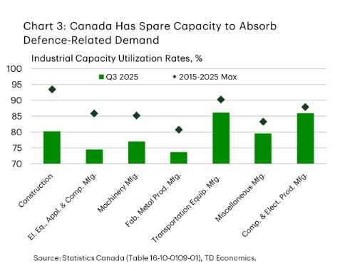 The bigger prize is capital spending, but it’s constrained: roughly half of procurement leaks abroad due to heavy reliance on foreign suppliers, muting multipliers. Still, Canada has meaningful spare capacity in defence-adjacent manufacturing (transport equipment, fabricated metals, machinery), where multipliers are high and inflation risks low, creating real upside if spending is timely and domestically anchored.