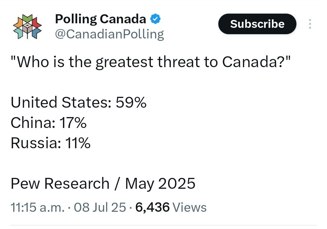 Taking a toll: Trump’s agitating has taken a toll on Canadian perceptions of the US. Canadians are voting with our wallets, as the trade war fuels a prolonged boycott of U.S. goods and travel. In a recent survey, Canadians overwhelmingly named the US as the greatest threat to our country — ahead of China and Russia: