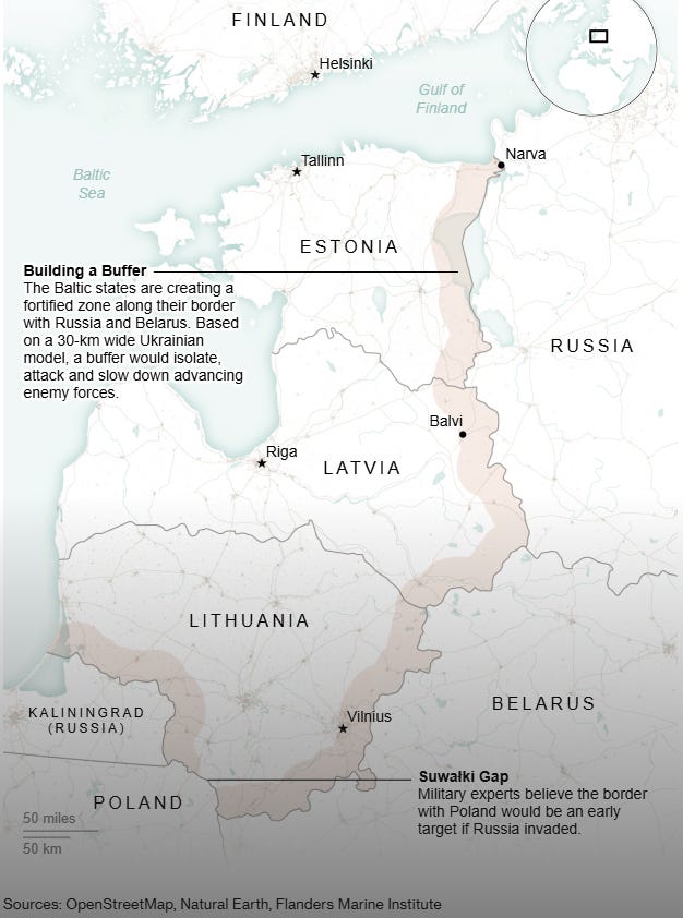 The Baltic countries are fortifying their frontier regions as a deterrent to Russian aggression… Bloomberg estimates a Russian invasion of the Baltics would cost the world $1.5 trillion in the first year