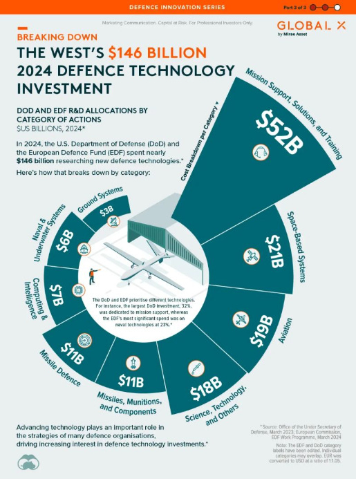 $146 billion: That is how much the U.S. DoD and the European Defence Fund invested in defence technology R&D in 2024. The biggest chunks went to: