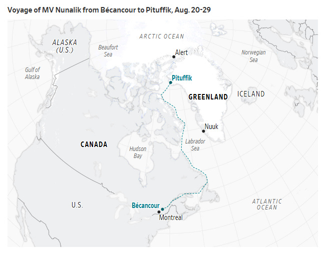 In a sign of how daunting Arctic operations can be, the Nunalik’s cargo wasn’t even destined for Greenland. From Pituffik, a plane would carry it farther north to Alert, a Canadian signals intelligence outpost only 500 miles from the North Pole—roughly the distance between New York and Detroit—and unreachable by cargo ship. A Canadian official said if anything was missing from the cargo, it could delay construction on the base by a year, until the next sealift.