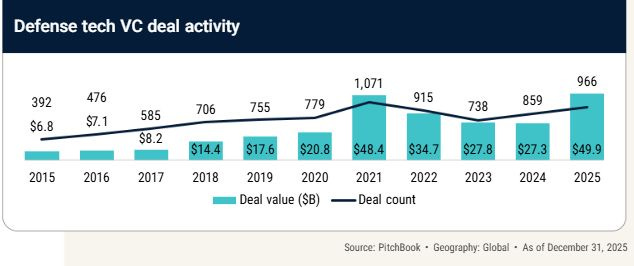 Bottom Line: Defence tech VC is in “industrialization mode,” not a Pentagon-prototype cycle: 2025 closed at $49.9B across 966 deals, with Q4 at $11.9B on 225 deals, signaling durable demand for scaled execution even as deal volume softened into year-end. Capital is clustering around readiness bottlenecks (autonomy + sensing + compute/infrastructure)