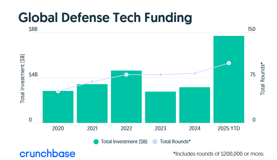 Funding to VC-backed startups in defence hit $7.7 billion across close to 100 deals in 2025, per Crunchbase data: